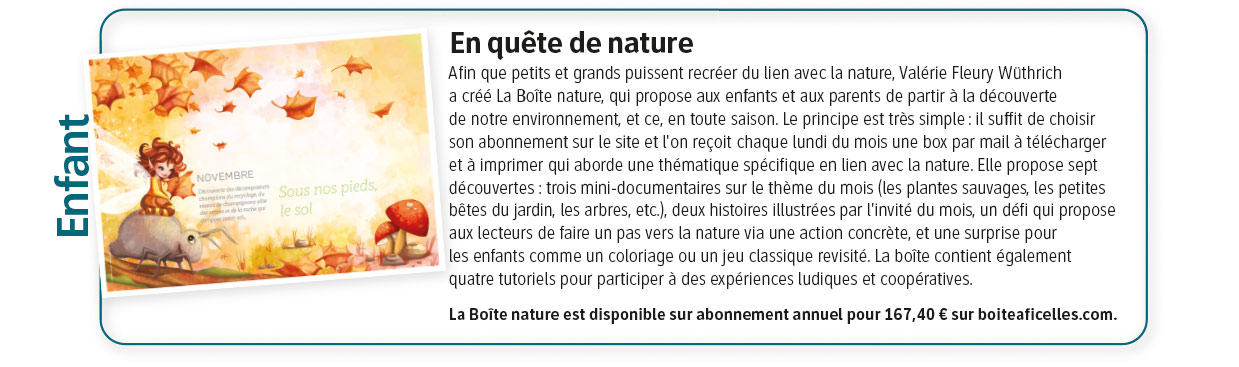 La «Boîte Nature» est une aventure d’une année (chaque mois, une thématique) à la découverte de la nature.